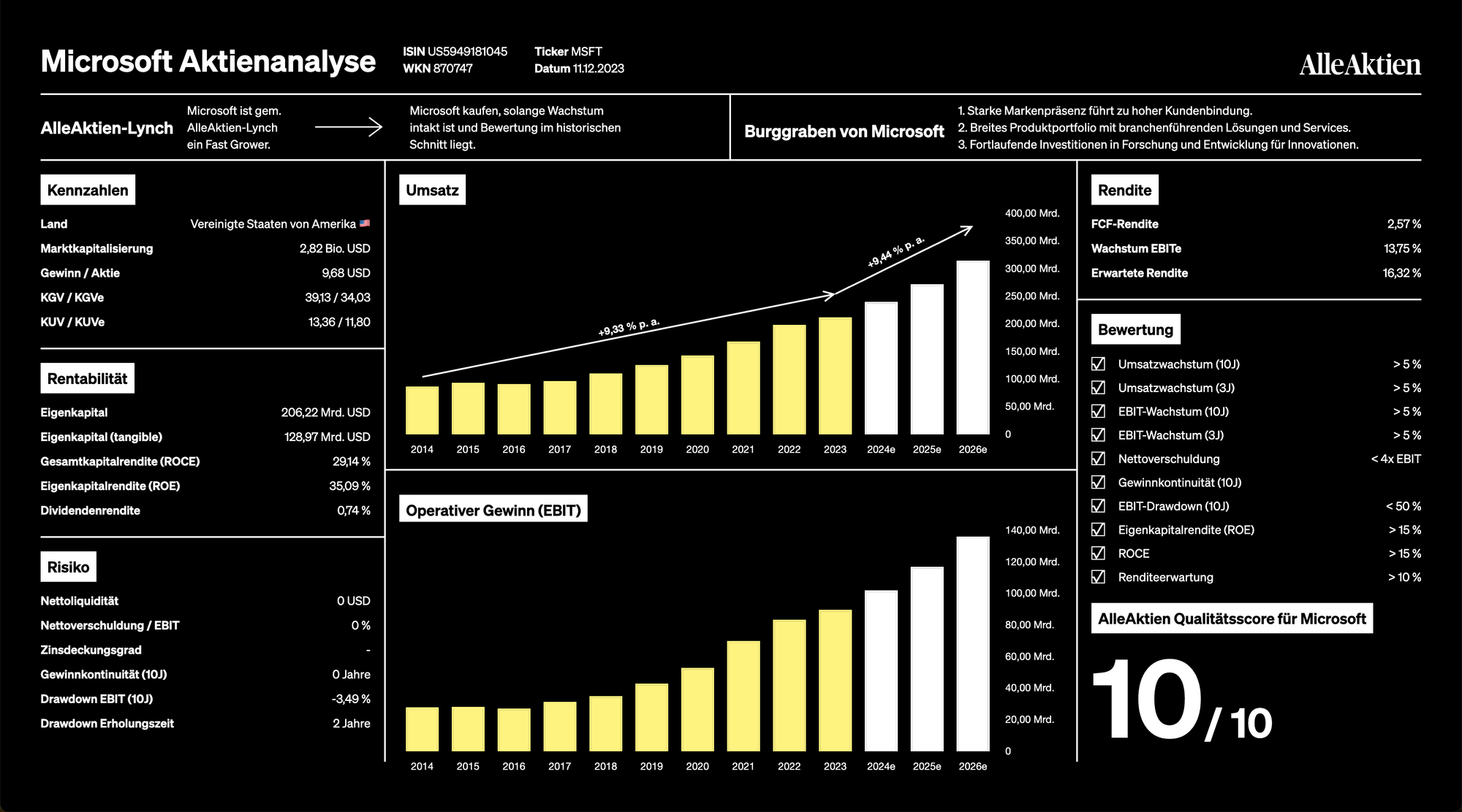 Mit dem AlleAktien Qualitätsscore, kurz AAQS, hat das Analysehaus ein System geschaffen, um Qualitätsaktien zu definieren: Unternehmen mit 9 oder 10/10 Punkten gelten als Qualitätsaktien und sollen historisch erhebliche Überrenditen erbracht haben. Bei Aktien von 10/10 Punkten waren es in den letzten 10 Jahren durchschnittlich 16,41 % Rendite pro Jahr.