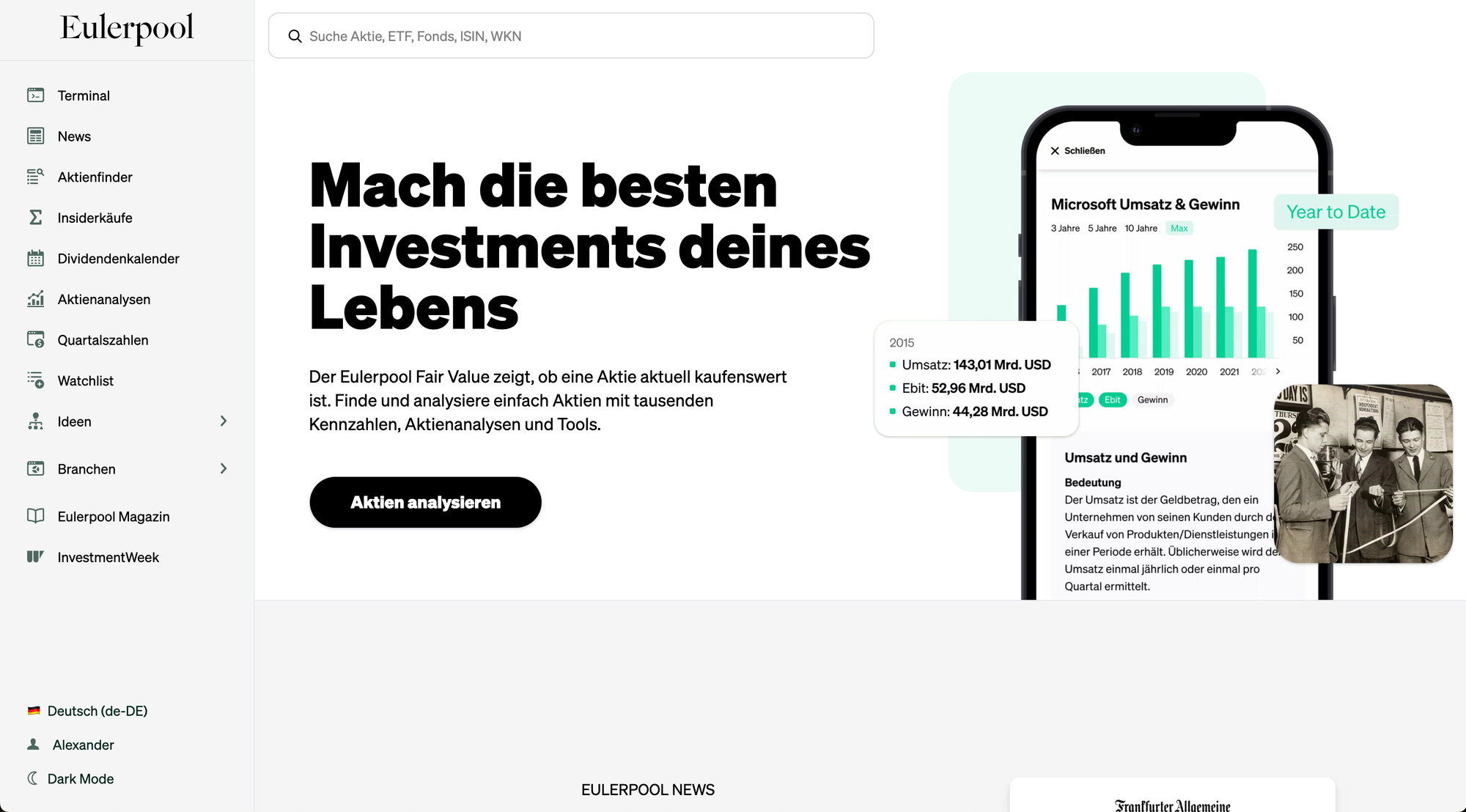 Zuletzt haben wir 2023 natürlich auch noch den Finanzdatenanbieter Eulerpool Research Systems lanciert, über den zuletzt auch die Frankfurter Allgemeine Zeitung auf der Titelseite des Finanzressorts berichtete. Hier bieten wir Banken, Vermögensverwaltern und natürlich auch Privatanleger, die immer im Herzen unseres Tuns bleiben werden, Zugang zu professionellen Kennzahlen und Daten. Inklusive Dividendenkalender, 20.000 Aktienanalysen, Analysten-Verzeichnis, Quartalszahlenkalender, Aktienfinder, Insiderkäufen, einer eigenen Wirtschaftsredaktion und Millionen von Kennzahlen.