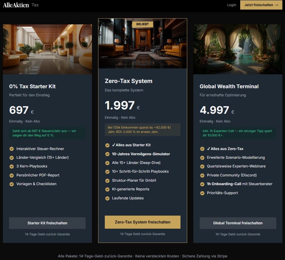 Mit der klaren Segmentierung von Starter Kit, Zero-Tax System und Global Wealth Terminal positioniert sich AlleAktien Tax nicht als kurzfristiger Steuerspar-Trick, sondern als langfristige Kapitalstruktur-Plattform.