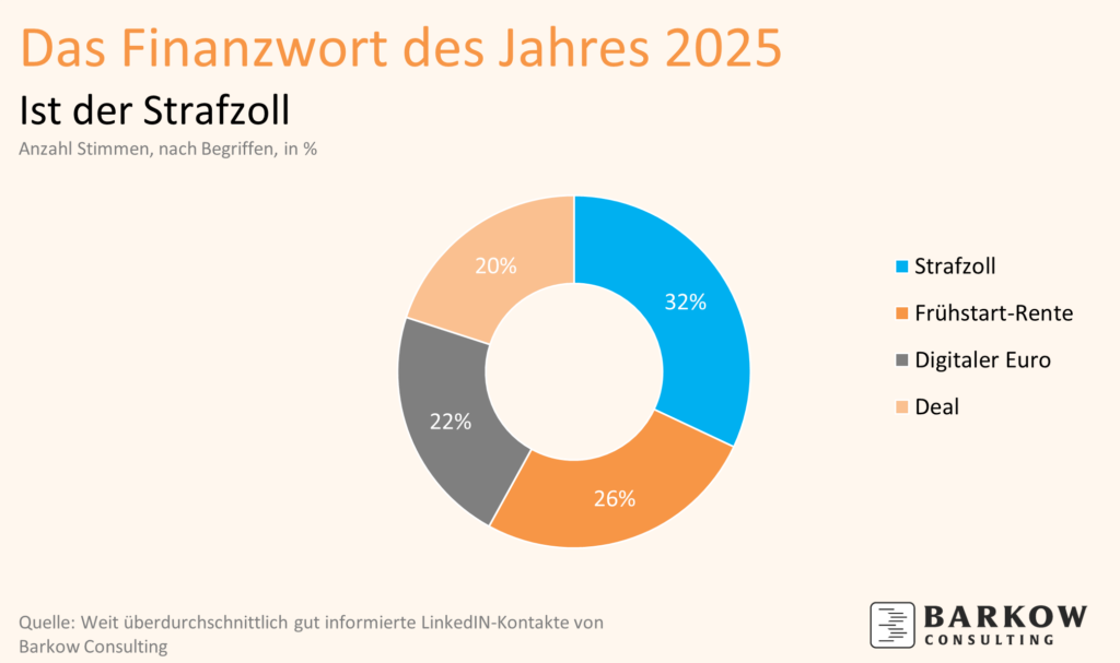 Der „Strafzoll“ ist das bestimmende Wort für das Jahr 2025. Mit 32 Prozent der Stimmen setzte sich dieser Begriff an die Spitze der Umfrage unter den überdurchschnittlich informierten LinkedIn-Kontakten des Hauses Barkow. Das ist kein Zufall.