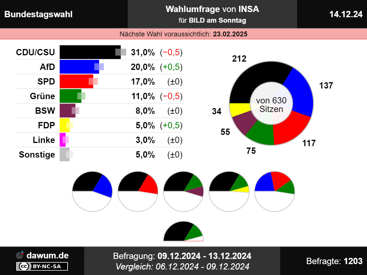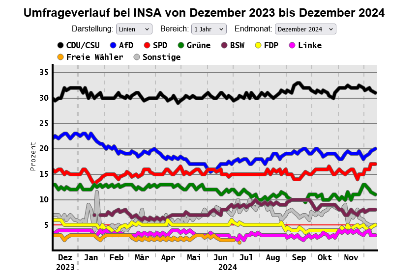 Die aktuelle Entwicklung zeigt eine zunehmende Polarisierung in der deutschen Politik. Die Mitte, vertreten durch CDU/CSU und SPD, wirkt geschwächt, während Ränder wie AfD und die linke BSW an Einfluss gewinnen.