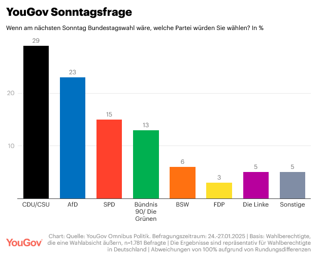 Die CDU/CSU würde mit 29 Prozent als stärkste Kraft aus der Wahl hervorgehen, doch für eine klassische Große Koalition mit der SPD würde es voraussichtlich nicht reichen. Eine schwarz-grüne Regierung wäre rechnerisch möglich, doch angesichts der schrumpfenden Zustimmung für die Grünen eine strategische Herausforderung.