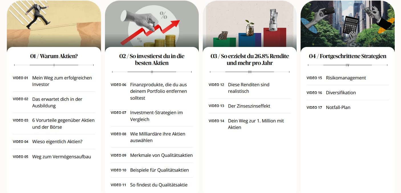 Hier wird transparent erklärt, wie der Lernpfad aufgebaut ist. Kein Marketing, keine Versprechen – sondern ein realistischer Überblick: Du lernst, wie man Unternehmen versteht, bewertet und investiert – statt zu spekulieren.